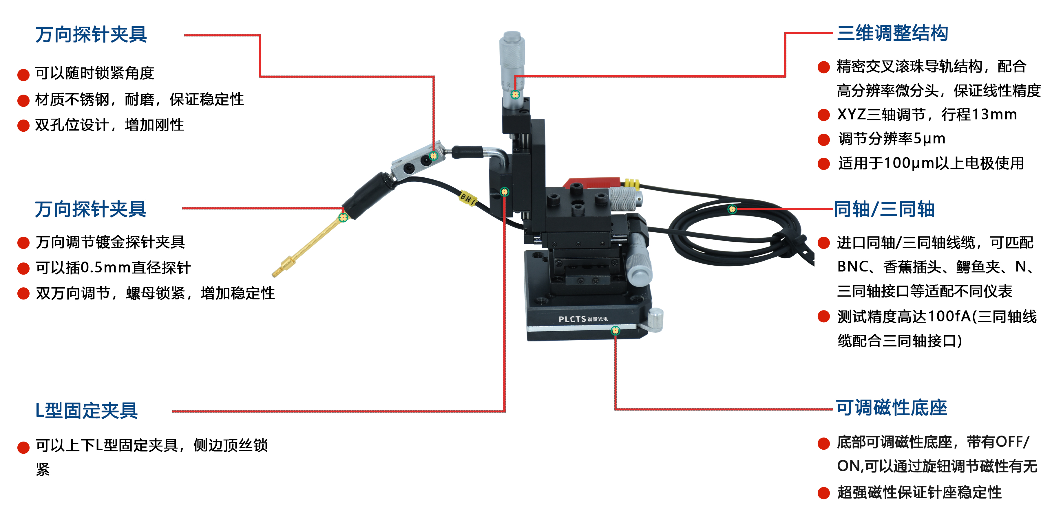 .主體材質(zhì)采用進(jìn)口航空鋁,表面噴砂氧化,優(yōu)異的機(jī)械性能; .采用進(jìn)口交叉滾珠導(dǎo)軌,保證良好的穩(wěn)定性; .整體采用進(jìn)口高分辨率微分頭,提高整體位移精度; . 配萬向調(diào)節(jié)夾具,可實現(xiàn)360°旋轉(zhuǎn)及360°傾斜調(diào)節(jié)(可鎖緊),適用于多種實驗環(huán)境; .探針夾具鍍金處理,適合測試IV等電學(xué)測試; .底部超強(qiáng)可調(diào)磁性底座,磁性吸附可達(dá)10Kg,保證扎針的穩(wěn)定性; |